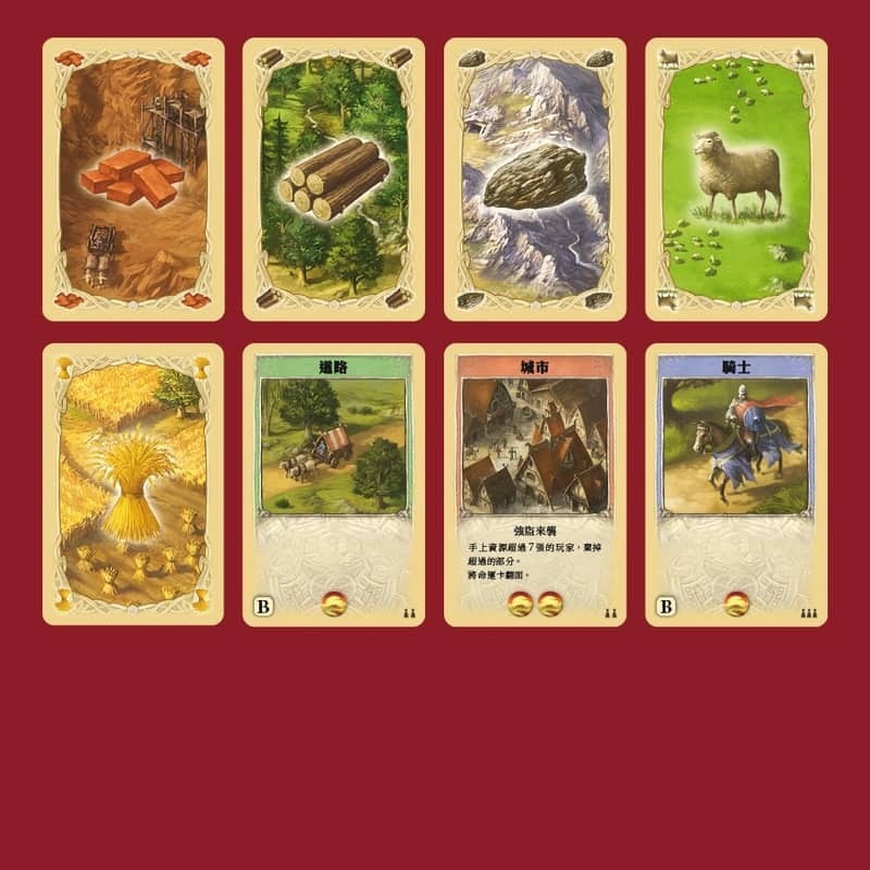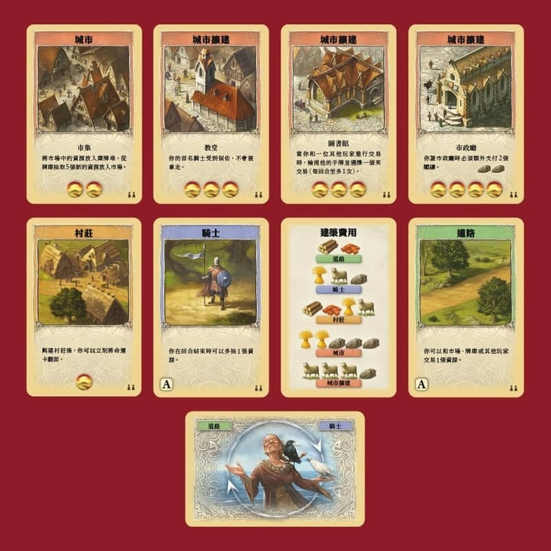 這是款節奏迅速的紙牌遊戲,目標是將資源善用在建造村莊、城市、城市擴建、騎士和道路,來獲得最佳的分數積累。
