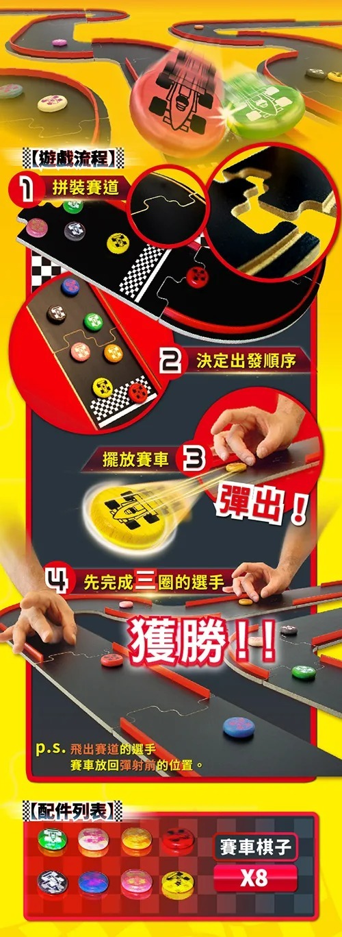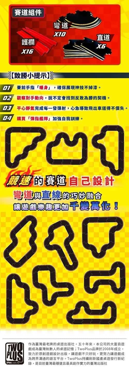 彈指賽車是一款歡樂刺激的彈射賽車遊戲,配件包含16片木製軌道,10道彎路與6道直路塑膠護欄,讓玩家自由組合出數十種總長2.5公尺的賽道。