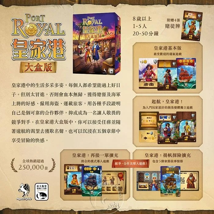 皇家港中的生活多采多姿,每個人都希望能過上好日子。但別太冒進,否則會血本無歸。獲得總督及海軍上將的好感、僱用海盜、運載旅客,用各種手段證明自己是個可靠的合作夥伴,抑或成為一名讓人敬畏的競爭對手。在皇家港大盒版中,你可以接受任務並隨著遠航的渴望去獲取名聲,也可以沉浸在五個章節中享受冒險的快感。