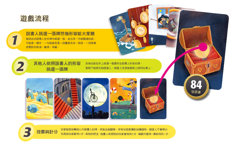 你要利用天生的才華以及直覺來找到它,同時也要躲開其他玩家所設下的陷阱。《說書人 Dixit》是一款令人感到驚奇、歡樂以及興奮的遊戲,適合讓你與你的家人以及朋友們一起遊戲。★2010 德國年度遊戲獎冠軍